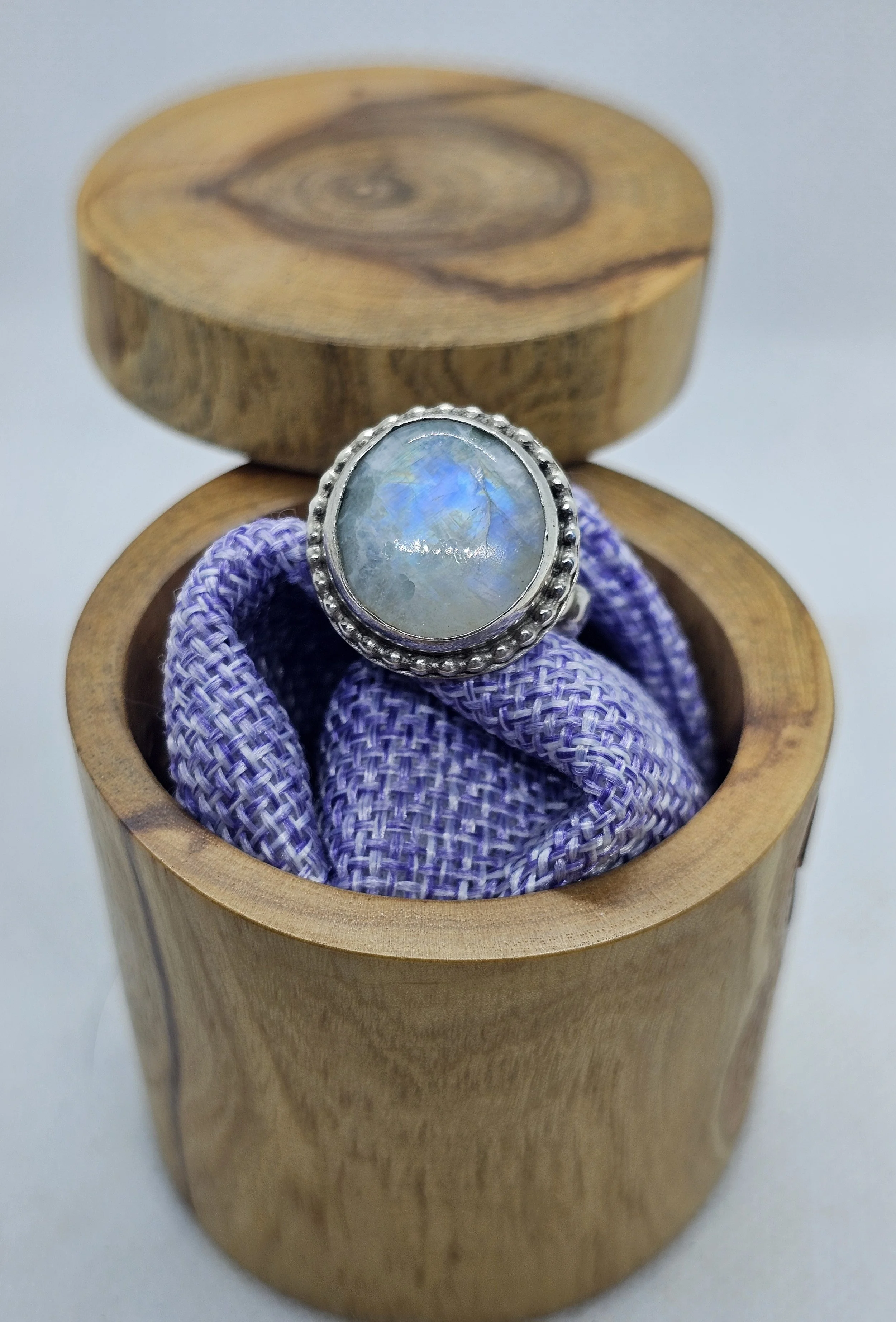 Gorgeous moonstone ring. The stone in this ring is so flashy. It is made with sterling silver and has a “pebble band”. It is a size 7.5.