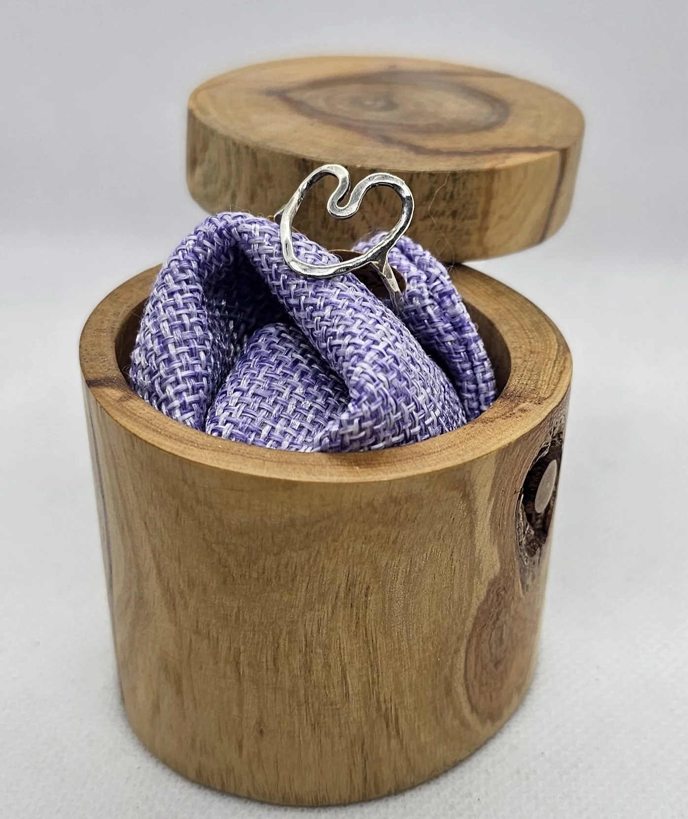 Sterling silver open heart ring. The heart is hand formed so no 2 rings are exactly alike. The ring and the band are hammered for texture. This one in the picture is a size 7. Send a message through the Contact Me page to request different size. Can also be made in gold filled.